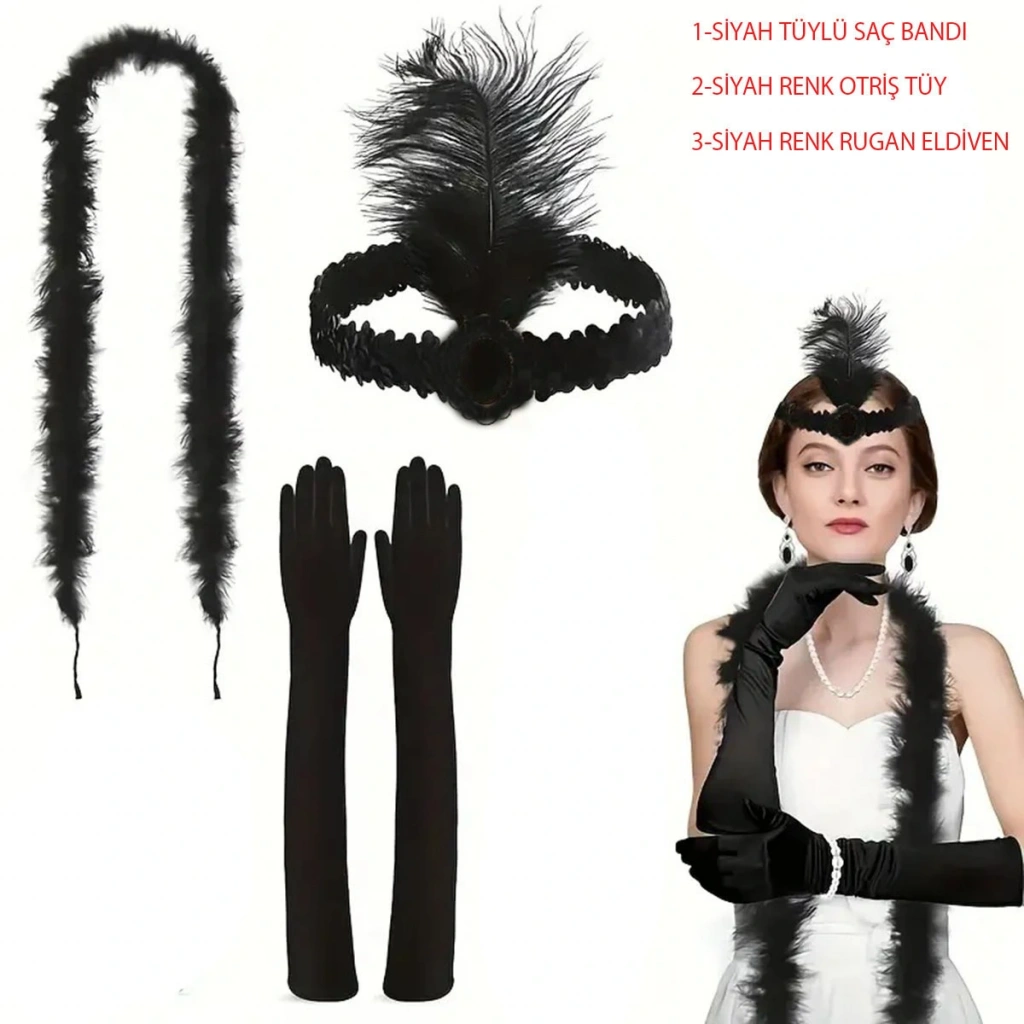 1920’LER TARZI SİYAH TÜYLÜ SAÇ BANDI, RUGAN SİYAH ELDİVEN VE SİYAH OTRİŞ SETİÜrün Özellikleri1920’ler tarzı siyah tüylü saç bandı, rugan siyah eldiven ve siyah otriş seti, nostaljik ve zarif görünümüyle özel günlerde dikkat çekici bir stil oluşturur. Esnek yapıya sahip tüylü saç bandı, başa rahatça oturur ve tüy detayıyla dönemin karakteristik havasını yansıtır. Rugan siyah eldivenler parlak yüzeyiyle şıklık katarken, bileğe kadar uzanan formuyla zarafeti tamamlar. Hafif ve kabarık dokulu siyah otriş ise kostüme hacim ve ihtişam kazandırır. Kostüm partileri, temalı davetler, tiyatro gösterileri veya özel çekimler için idealdir. Dayanıklı malzeme yapısı uzun ömürlü kullanım sunar ve kolay taşınabilir olmasıyla pratik bir set olarak öne çıkar.Paket İçeriği1 adet siyah tüylü saç bandı, 1 çift rugan siyah eldiven, 1 adet siyah otriş