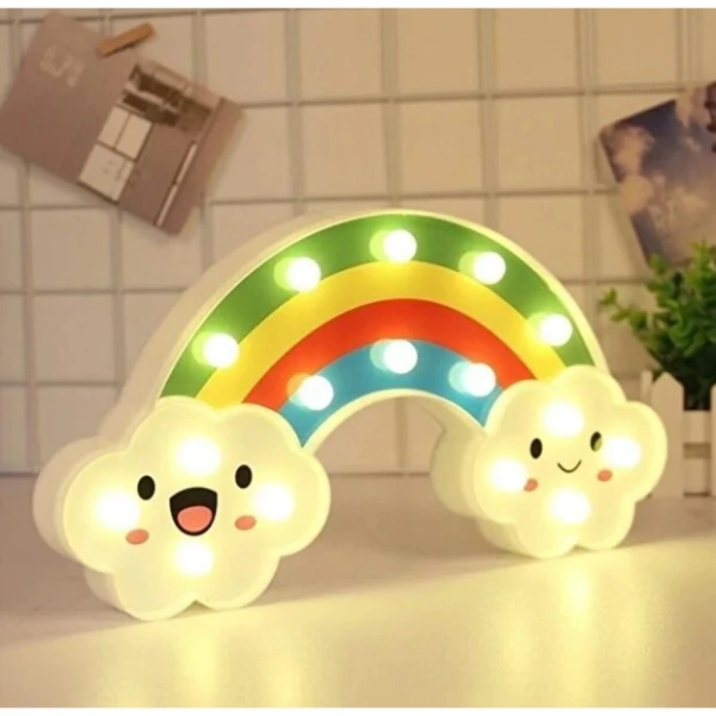 GÜLEN BULUTLU GÖKKUŞAĞI LED GECE LAMBASIÜrün ÖzellikleriGülen Bulutlu Gökkuşağı LED Gece Lambası, çocuk odalarına neşe ve huzur katmak için tasarlanmış dekoratif ve işlevsel bir aydınlatmadır. 30x16 cm boyutundaki bu şirin gece lambası, gökkuşağı formu ve gülen bulut figürleriyle hem sevimli bir aksesuar hem de yumuşak ışığıyla rahatlatıcı bir gece arkadaşıdır.Arkasında bulunan asma yerleri sayesinde dilerseniz duvara monte edebilir, dilerseniz masa üstünde kullanabilirsiniz. Kalem pil ile çalışır ve piller pakete dahil değildir. Gün ışığı rengindeki yumuşak LED ışıkları göz yormaz, loş bir ambiyans oluşturarak çocukların daha huzurlu uyumasına yardımcı olur. Ayrıca enerji tasarruflu yapısıyla uzun süreli kullanım sağlar.Hem çocukların odasında dekoratif bir obje olarak hem de gece lambası ihtiyacını karşılayan bu ürün, şirin tasarımıyla eğlenceli ve güvenli bir ortam oluşturur. Sevdiklerinize hediye edebileceğiniz ideal bir seçenek olarak da öne çıkar.Paket İçeriği1 adet Gülen Bulutlu Gökkuşağı LED Gece Lambası